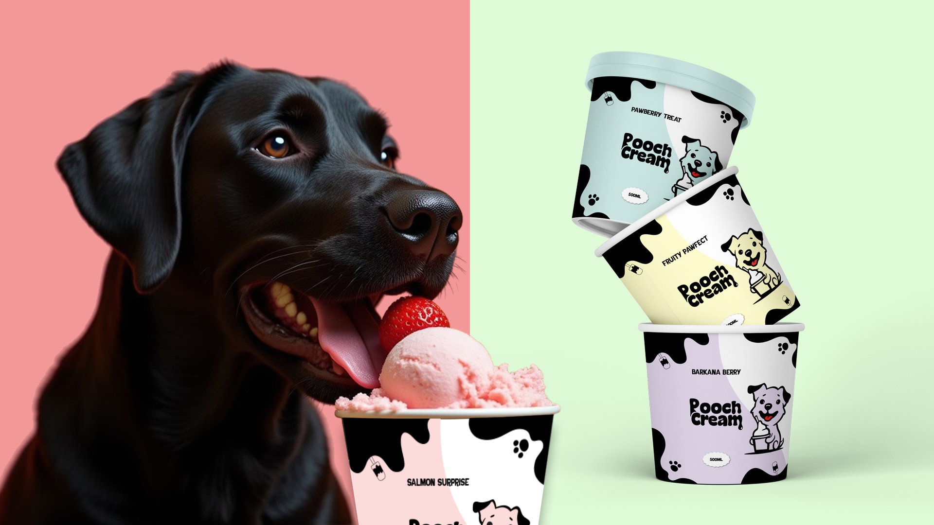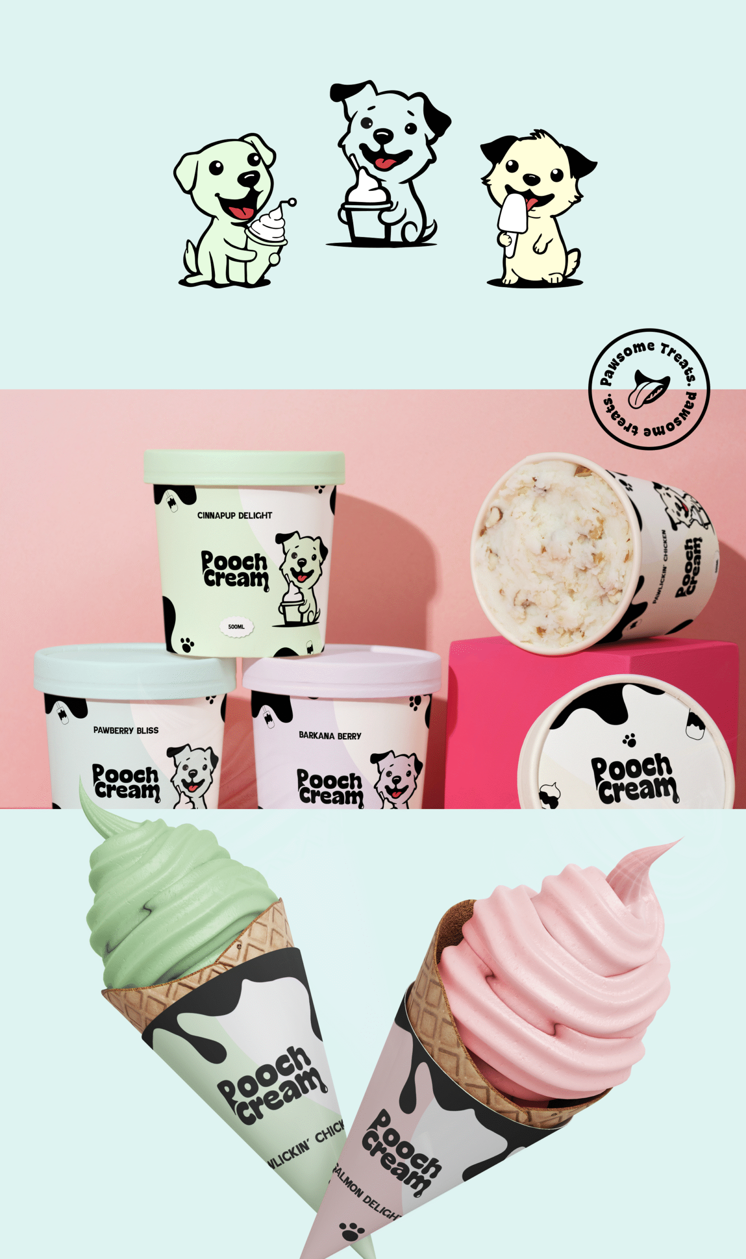 We crafted a bespoke logo where “Pooch Cream” is stacked playfully, with the “cream” component incorporating dripping ice cream imagery, a clever nod to indulgence. Accompanying logo variations include a joyful dog illustration, reinforcing approachability and fun.